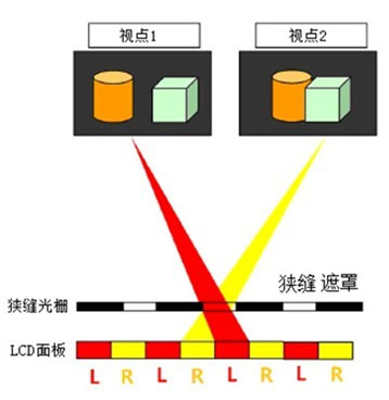 狭缝光栅是目前流行的立体裸眼显示技术。狭缝光栅与柱透镜光栅的分光原理基本相似。狭缝光栅采用垂直遮罩阵列来分离左、右眼图像。如果一个垂直狭缝光栅阵列设计正确,将有一个视点位置使每只眼睛可以通过狭缝间的空隙看到偶数或奇数列的像素,左眼和右眼分别看到对应的视差图像,从而实现立体显示。