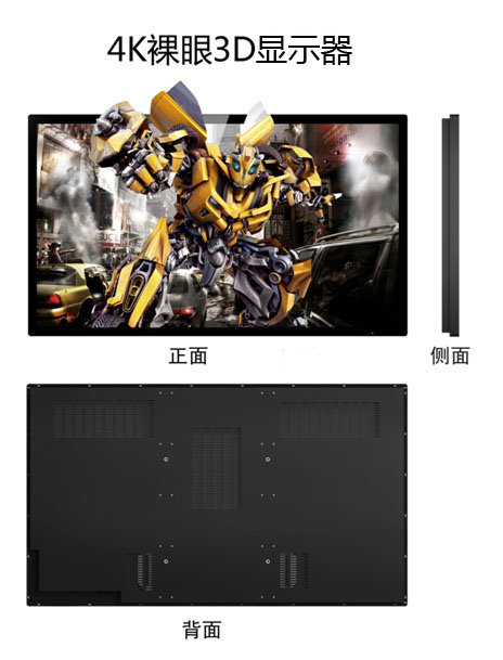 天禄光电自主研发成功的65寸4K裸眼3D显示器,毫不夸张的讲,这款产品是市面上迄今为止显示效果最好的裸眼3D显示器。该款产品采用的是4K UHD液晶屏,分辨率高达3840×2160,是全高清液晶屏的4倍,四倍全高清画质,让画面的每一处细节都分毫毕现。同时结合裸眼3D技术,达到了视网膜显示技术和裸眼3D视觉心理的完美结合。采用黑色钣金外框,超薄外观,坚固耐用,高端大气。