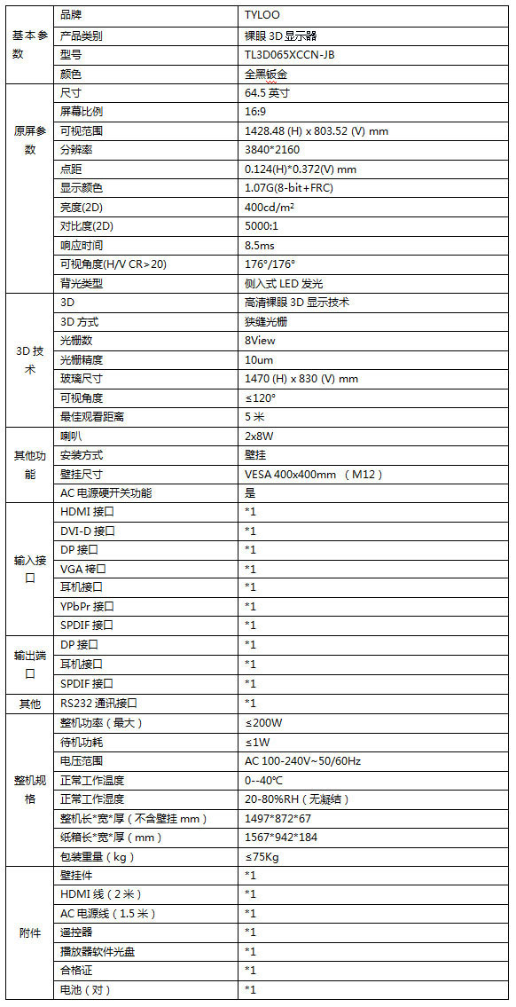 产品规格参数 TL3D065XCCN-JB裸眼3D显示器产品规格书